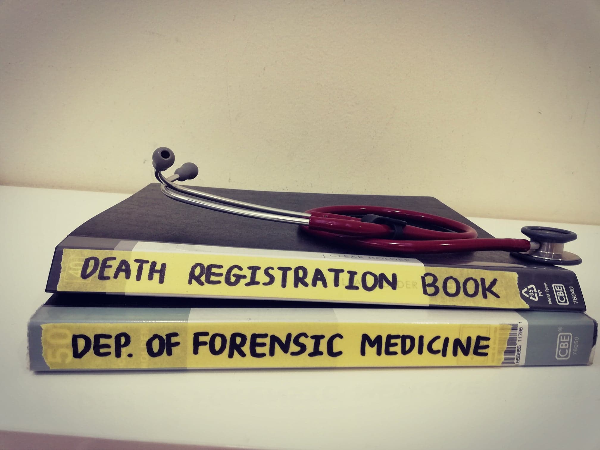 The Assistant Medical Officer on duty has used Red Ink to record details regarding the deceased in the Death Registration Book, along with a form known as “Form for Management of a Dead Body”.