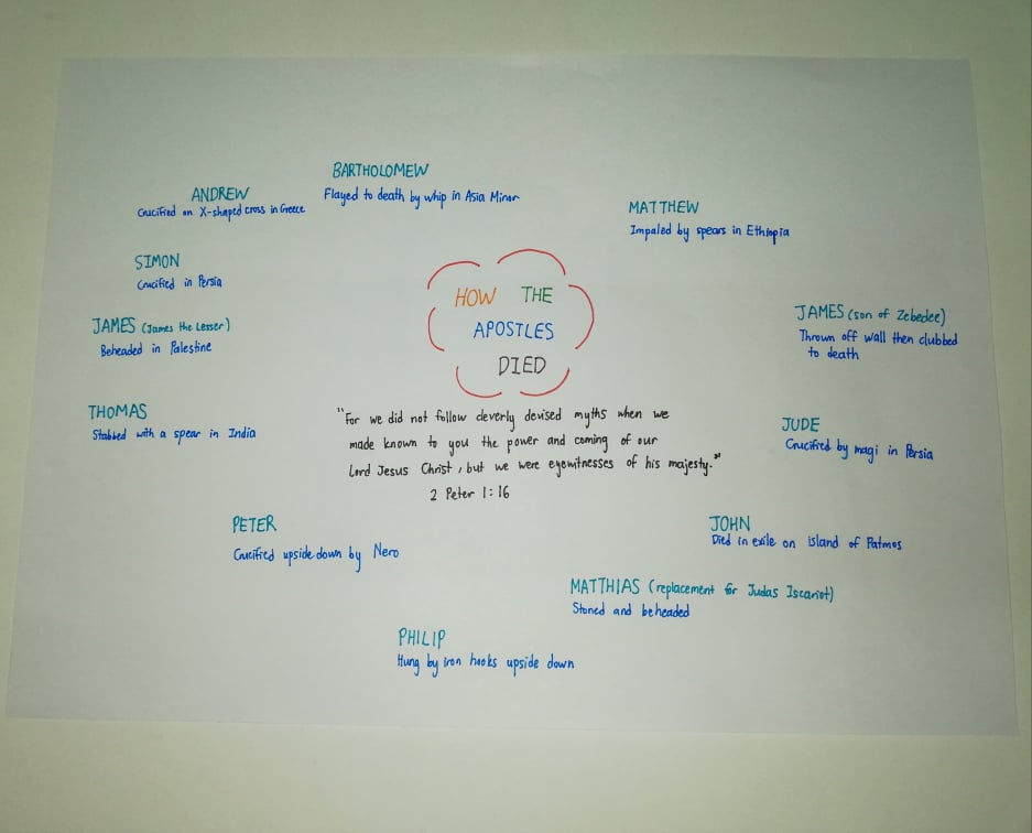 In years to come, you will see the Apostles get martyred for their faith, a sign of conviction of their belief. Only one disciple, John, would die of old age, as seen in this diagram you drew so carefully: